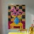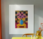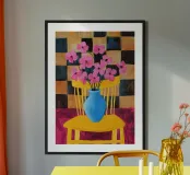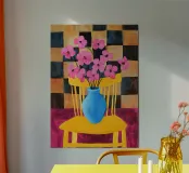 Quadro acrilico con fiori rosa in un vaso blu su una sedia di legno gialla, con sfondo a scacchiera nero e beige, in uno stile semplice e minimalista, nello stile di Matisse.