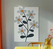 White flowers with orange centers are arranged. The petals are simple and symmetrical, connected by dark green stems and leaves.