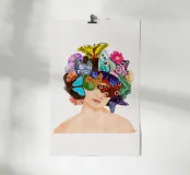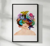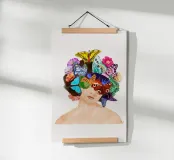 Collage disegnato e dipinto basato sulla propria fotografia. Ritratto di donna disegnato a mano e in digitale, con la testa ricoperta di farfalle e fiori. Un'esplosione di colori su uno sfondo tranquillo. Tutti i lavori di Good Blue sono realizzati senza l'uso di AI.
