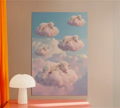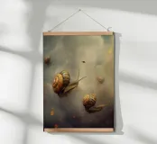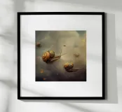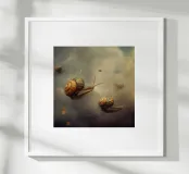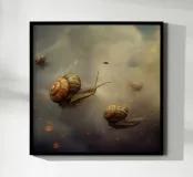 A surreal composition featuring snails gliding effortlessly through a dreamy sky filled with soft clouds and scattered glowing embers. The whimsical scene blends fantasy and nature, creating a unique and magical atmosphere with delicate, otherworldly charm.