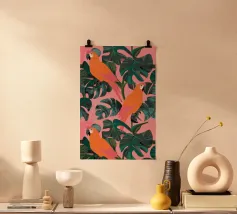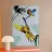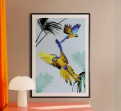 Due pappagalli in un'illustrazione in tutte le tonalità del blu e del giallo.