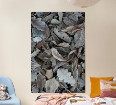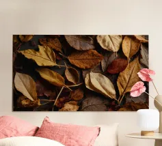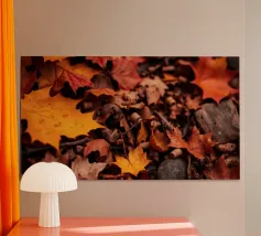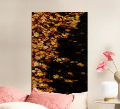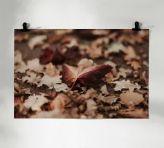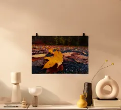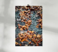 Varie tonalità di foglie autunnali ricoprono il terreno, mostrando un mix di gialli, marroni e rossi tipici del tardo autunno. Questo tranquillo spettacolo della natura evoca il cambiamento stagionale e la bellezza.