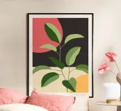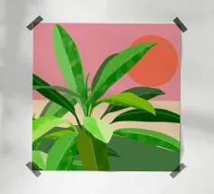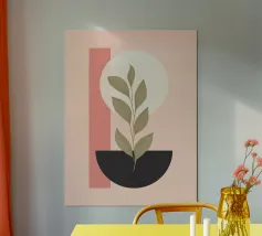 Una composizione botanica astratta caratterizzata da foglie stilizzate e una semplice forma di sole.