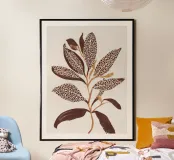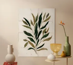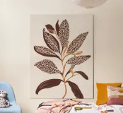 An elegant botanical study featuring elongated leaves patterned with bold dotted textures in deep brown and ochre tones. The clean ivory ground enhances the organic rhythm of the branch, blending minimalism with natural ornament.