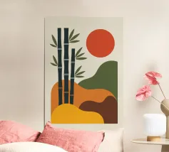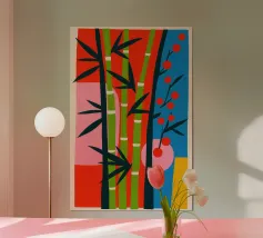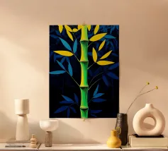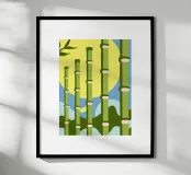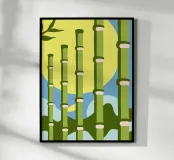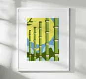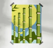 Un'illustrazione che presenta una foresta di bambù con uno stile semplice, utilizzando i colori verde, blu e giallo. Questa illustrazione offre un aspetto calmo e naturale.