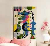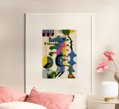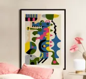 Un dipinto astratto con varie forme e linee colorate, tra cui cerchi, curve e forme geometriche, che creano una composizione dinamica e moderna.