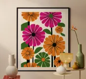 Audace, giocosa e artistica, questa opera d'arte botanica ispirata alla metà del secolo scorso porta lo spirito di Matisse nella casa moderna. Forme floreali sovradimensionate in toni retrò come il rosso pomodoro, il giallo senape, il corallo tenue e il verde acqua sono disposte in stile collage su uno sfondo chiaro. La composizione astratta bilancia il flusso organico con la chiarezza grafica, perfetta per creare un look vivace ma curato. Ideale come elemento di spicco in salotti, studi o spazi di lavoro creativi.
