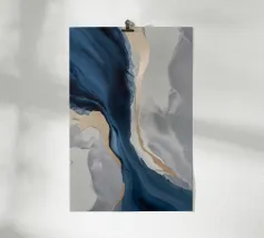 Pittura a olio astratta con forme bianche e blu chiaro, completate da beige, blu navy e grigio su uno sfondo chiaro. Curve e pennellate delicate creano una composizione minimalista e moderna con una superficie strutturata.