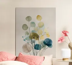 Una composizione minimalista ad acquerello con steli sottili e forme astratte di foglie nei colori verde intenso, blu, tortora e ocra. La disposizione verticale e le delicate pennellate di colore evocano un'eleganza tranquilla e organica, perfetta per interni moderni e ispirati alla natura.