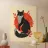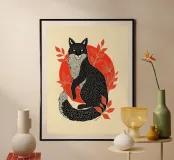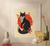 Add wild elegance to your space with this linocut-style fox art print. Featuring a black fox with intricate white fur detailing, framed by red botanical leaves and a bold sun, this piece blends folk art charm with modern minimalism. Perfect for fans of nature prints, Scandinavian decor, and woodcut-style animal art.