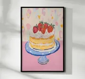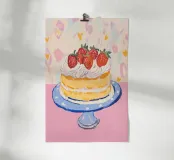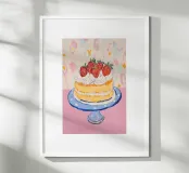 A visually delightful strawberry shortcake topped with fresh strawberries and whipped cream, displayed on a charming blue polka dot stand.