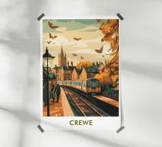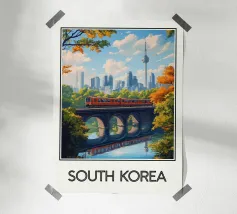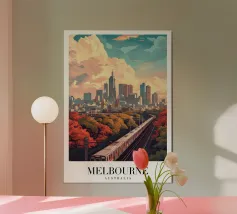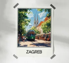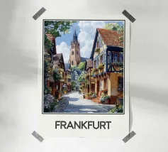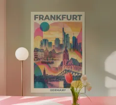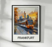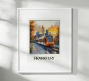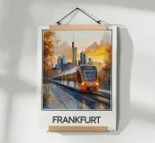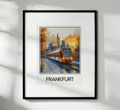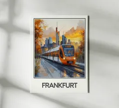 Poster che mostra un moderno tram che attraversa Francoforte al tramonto, con lo skyline della città e gli alberi autunnali sullo sfondo. Un'accattivante e calda scena urbana per una decorazione murale unica.
