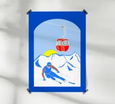 illustrazione minimale sulla montagna e lo sci, immergetevi in un'illustrazione vibrante e minimale che cattura l'essenza dello sci di montagna, provate il brivido dell'avventura con ogni tratto colorato.