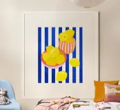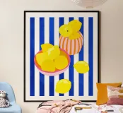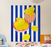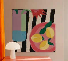 Una vivace natura morta caratterizzata da limoni gialli e brillanti in giocose ciotole rosa e arancioni. Le audaci strisce bianche e blu sullo sfondo aggiungono un'atmosfera fresca e mediterranea. Un tocco di colore perfetto per gli amanti degli agrumi e dell'arte moderna!