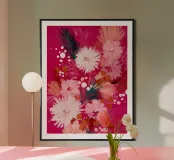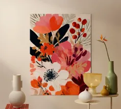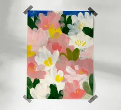 Vibrant pinks and whites dance together in a bold, festive bouquet. This energetic floral painting brings instant cheer, ideal for holiday decor or year-round celebration of color.