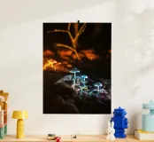 I loro cappelli emettono una delicata tonalità verde-azzurra, illuminando le foglie circostanti e il terreno umido. Minuscoli puntini di luce sembrano librarsi nell'aria, come se i funghi fossero piccole lanterne che guidano il cammino. L'intera scena sembra mistica e ultraterrena, trasformando la notte in un tranquillo e luminoso paese delle meraviglie.