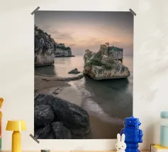 The sea laps gently against the rocks while the sky burns with golden light. An atmospheric mural for anyone who loves the coast and evening colours.