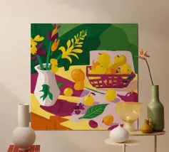 Un'opera d'arte astratta vibrante ed espressiva con una fusione di colori audaci di ispirazione fauvista come il magenta, l'arancione e il nero. Le pennellate e le forme energiche creano un'opera dinamica e appassionata.