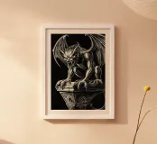 Un terrificante gargoyle dall'espressione demoniaca siede su un piedistallo a colonna riccamente decorato con le ali spalancate. I suoi artigli affilati si conficcano nella pietra, mentre la bocca spalancata mostra minacciosamente i denti. Le linee dettagliate conferiscono alla figura profondità e un effetto drammatico che ricorda la mezzatinta classica. Lo sfondo scuro mette ancora più in risalto la sinistra creatura ed enfatizza la sua minacciosa presenza. Un motivo di grande effetto per gli amanti dei mondi fantasy oscuri.