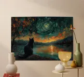 gatto lago cielo notturno stelle galassia nuvole vorticose alberi silhouette riflesso acqua montagne orizzonte foglie d'autunno crepuscolo crepuscolo bagliore paesaggio natura riva rami