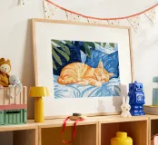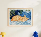 gatto gatto arancione gatto che dorme letto cuscini piante fogliame pianta da interno foglie tropicali foglie di monstera cuscini relax arredamento per la casa animale domestico riposo consistenza morbida animale domestico calma tempo libero foglie verdi