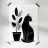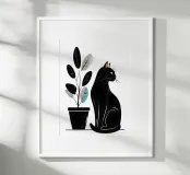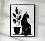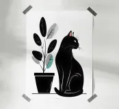 Un'illustrazione stilizzata raffigura un elegante gatto nero seduto in posizione eretta accanto a una pianta in vaso. Il gatto è raffigurato di profilo, con la testa leggermente girata verso destra, che mette in evidenza i baffi e le orecchie a punta. La pianta ha grandi foglie ovali nei toni del nero, del grigio e di un tocco di verde acqua, inserite in un semplice vaso nero.