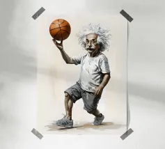 Albert Einstein davanti ai suoi appunti di genio. Una caricatura della straordinaria mente scientifica.