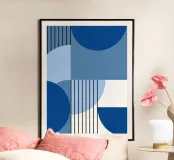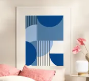 Questo poster gioca con diverse tonalità di blu e forme geometriche di base - semicerchi, cerchi, quadrati e linee verticali - per reinterpretare l'estetica Bauhaus. Le linee nere verticali creano un senso di struttura e ritmo, mentre le forme intrecciate trasmettono profondità e movimento. La palette di colori spazia dal celeste chiaro al ricco blu cobalto, trasmettendo calma e precisione allo stesso tempo, tipica della chiarezza del design Bauhaus.