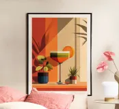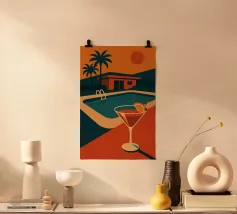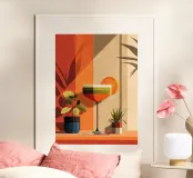 A modern still life inspired by Bauhaus principles and mid-century poster design. Geometric forms, layered color blocks, and warm aperitif tones create a structured yet playful composition centered around a stylized cocktail scene. The balance of bold shapes and refined details makes this artwork a strong visual accent for contemporary, design-focused interiors.
