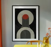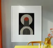 Una composizione geometrica presenta un grande cerchio intersecato da linee verticali, sormontato da un audace cerchio rosso. Gli elementi monocromatici contrastano con uno sfondo scuro e vorticoso.