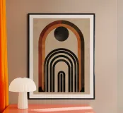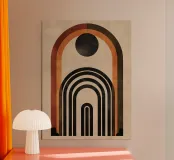 Questo design colpisce per l'armonia degli archi e per la palette di colori caldi e terrosi in marrone, nero e arancione. Le linee geometriche pulite e il sottile tocco vintage lo rendono un'attrazione senza tempo per qualsiasi casa moderna o nostalgica. Perfetto per l'arte da parete, i cuscini o gli accessori per la casa, per dare alla vostra stanza uno stile elegante e unico.
