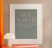 Un messaggio umoristico viene visualizzato in rosa chiaro e testo bianco su uno sfondo grigio tenue, incoraggiando le persone a "mettersi a nudo" con un avvertimento scherzoso per i visitatori. Il design pulito e minimalista sottolinea la natura spiritosa della citazione.