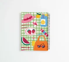 Un'allegra vista dall'alto di un picnic estivo su una coperta di percalle, con anguria, limonata, un libro e occhiali da sole che creano un flatlay perfetto.