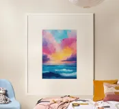 Un tramonto incandescente bagna l'oceano in un mare di colori. Nuvole colorate si riflettono nell'acqua, catturate con la potente tecnica della pittura a olio. Linee e forme semplici, combinate con pennellate decise, creano un elevato contrasto e un'atmosfera da sogno. Lasciatevi incantare dalla tranquillità e dalla bellezza di questa scena e portate un tocco di fantasia nella vostra casa.