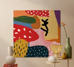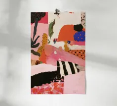 Un collage astratto vibrante ed eclettico caratterizzato da un mix di motivi audaci, tra cui righe, stampa ghepardo e pois. La composizione è un'espressione giocosa ed energica di uno stile moderno bohémien o massimalista.