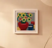 Un'allegra natura morta con un bouquet di fiori gialli in un audace vaso rosso. Un piccolo cilindro blu lo affianca, creando una semplice composizione di colori primari, moderna e giocosa su uno sfondo grigio neutro.