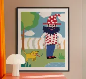 Un personaggio stravagante che assomiglia a un giullare o a un clown, con un vestito a pois e un cappello a punta, porta allegramente a spasso un piccolo cane giallo.