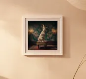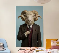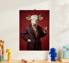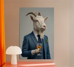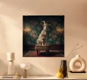 Un ritratto stravagante ma allo stesso tempo silenziosamente autorevole, che pone un soggetto insolito al centro di un interno raffinato. Seduta su uno sgabello imbottito, la figura guarda lo spettatore con calma curiosità, con un atteggiamento giocoso e padrone di sé. L'illuminazione morbida e pittorica e l'ambiente decorato conferiscono alla scena un'eleganza senza tempo, trasformando l'inaspettato in qualcosa di stranamente dignitoso.