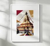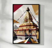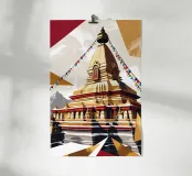 Questo pezzo astratto presenta un'interpretazione geometrica degli stupa dorati del Nepal, con bandiere di preghiera vibranti che aggiungono un tocco vivace. I motivi audaci e i contrasti sorprendenti evidenziano l'eleganza architettonica del Nepal e la sua ricchezza culturale. L'opera d'arte cattura l'armonia tra lo stupa sacro e il paesaggio himalayano circostante, riflettendo l'atmosfera spirituale unica del Nepal. Ideale per gli amanti dell'arte e dei viaggi, questo pezzo incarna l'anima del Nepal in una forma artistica contemporanea.