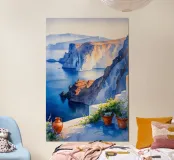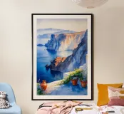 Un acquerello accattivante che mostra le drammatiche scogliere di Santorini durante l'ora d'oro. La calda luce del sole mette in risalto la naturale consistenza delle rocce, contrastando meravigliosamente con le calme acque blu intenso sottostanti. In primo piano sono presenti incantevoli vasi di terracotta ornati di fiori, che fondono il fascino architettonico dell'isola con il suo splendido paesaggio naturale. Questo pezzo cattura perfettamente la bellezza armoniosa di Santorini.