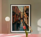 Un gondoliere con camicia a righe e cappello di paglia manovra abilmente la sua gondola attraverso uno stretto canale veneziano. I caldi edifici in terracotta, ornati da balconi fioriti, creano un contrasto sorprendente con le acque verde smeraldo. La pagaia costante del gondoliere genera leggere increspature sulla superficie riflettente, rispecchiando l'architettura storica. La luce del sole filtra tra gli edifici, proiettando una luce dorata sulla scena, evocando il fascino senza tempo di Venezia.