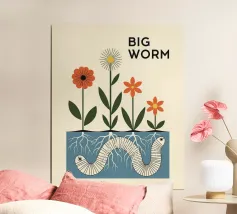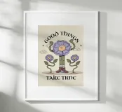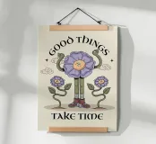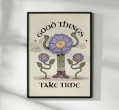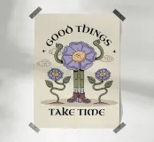 Un fiore stravagante e illustrato si erge orgoglioso, alzando le braccia in segno di festa, circondato da compagni in fiore e morbide nuvole. Con dettagli giocosi e calde tonalità vintage, quest'opera d'arte ci ricorda di rimanere pazienti, avere fiducia nella crescita e goderci il viaggio verso risultati positivi e momenti significativi nella vita.