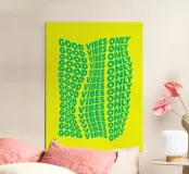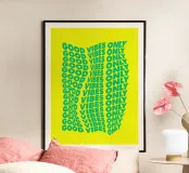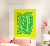 Portate una ventata di positività nel vostro spazio con questa stampa artistica "Good Vibes Only". Caratterizzata da scritte verdi ondulate e sovrapposte su un radioso sfondo giallo, questo disegno giocoso irradia energia e ottimismo. Perfetto per rallegrare salotti, camere da letto, uffici o da regalare per compleanni, inaugurazioni o Natale. Il carattere dinamico e distorto e i colori vivaci si fanno notare, creando un punto focale edificante che ispira felicità e gioia ogni giorno.