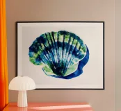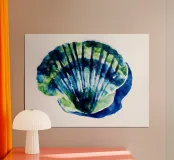 Una vivace rappresentazione ad acquerello di una conchiglia dipinta con sfumature di blu e freschi toni verde mare. Le pennellate radiali richiamano la struttura naturale a ventaglio della conchiglia, creando un senso di movimento e di delicata energia. Le sfumature traslucide e la texture organica mantengono l'opera leggera e ariosa, mentre i contrasti cromatici audaci aggiungono interesse visivo. Ideale per interni costieri, contemporanei o ispirati alle spa, quest'opera d'arte conferisce a qualsiasi spazio un accento fresco e rinfrescato dall'oceano e un senso di calma marina.