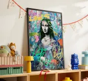 Graffiti Mona Lisa: "L'arte di strada incontra l'eleganza classica". Questo design mozzafiato trasforma l'iconica Monna Lisa di Leonardo da Vinci in un capolavoro urbano. La sovrapposizione di graffiti luminosi, colori audaci e linee dinamiche conferisce al ritratto classico un tocco moderno e ribelle. Una dichiarazione perfetta per gli amanti della street art e dell'arte classica, sia come poster che come decorazione murale o oggetto di moda.