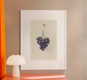 Illustrazione botanica vintage splendidamente dettagliata di un grappolo d'uva viola scuro appeso a un delicato stelo. La resa realistica cattura la sottile lucentezza della buccia del frutto e l'asimmetria organica della natura. Lo sfondo rimane morbido e neutro, enfatizzando la ricchezza dell'uva. Un piccolo chiodo e uno spago fissano il gambo, aggiungendo un fascino antico. Questa opera d'arte senza tempo evoca l'essenza degli studi botanici tradizionali, perfetta per gli amanti delle illustrazioni d'epoca e delle decorazioni ispirate alla natura. Jean Bernard, 1775