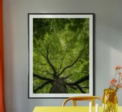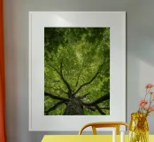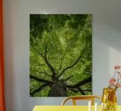 Poster di alta qualità che rappresenta una chioma verde lussureggiante vista dal basso. Perfetto per decorare soggiorni, uffici o stanze da letto con un tocco di natura rilassante. Realizzato con carta premium, rispettosa dell'ambiente e con stampa nitida certificata secondo gli standard UE.