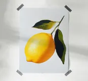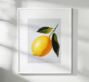 Raffinata illustrazione di un limone appeso al ramo, con le sue foglie delicate, su uno sfondo bianco puro. Un'immagine minimalista ed elegante, perfetta per una decorazione murale moderna e naturale.
