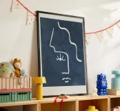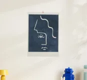 Esplora l'arte contemporanea con questa stampa in legno raffigurante un volto stilizzato su sfondo blu. Perfetta per arredare qualsiasi ambiente con un tocco moderno e sofisticato, ideale per il soggiorno, la camera da letto o l'ufficio.