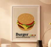 Questa opera d'arte aggiunge un tocco giocoso e senza tempo a qualsiasi spazio. Perfetta per le cucine, le tavole calde e gli amanti degli hamburger, è un modo elegante per dare un tocco vintage al vostro arredamento. Celebrate il fascino classico di un succulento hamburger con questo poster in stile retrò! Caratterizzato da un design audace e minimalista di un singolo hamburger perfettamente impilato.